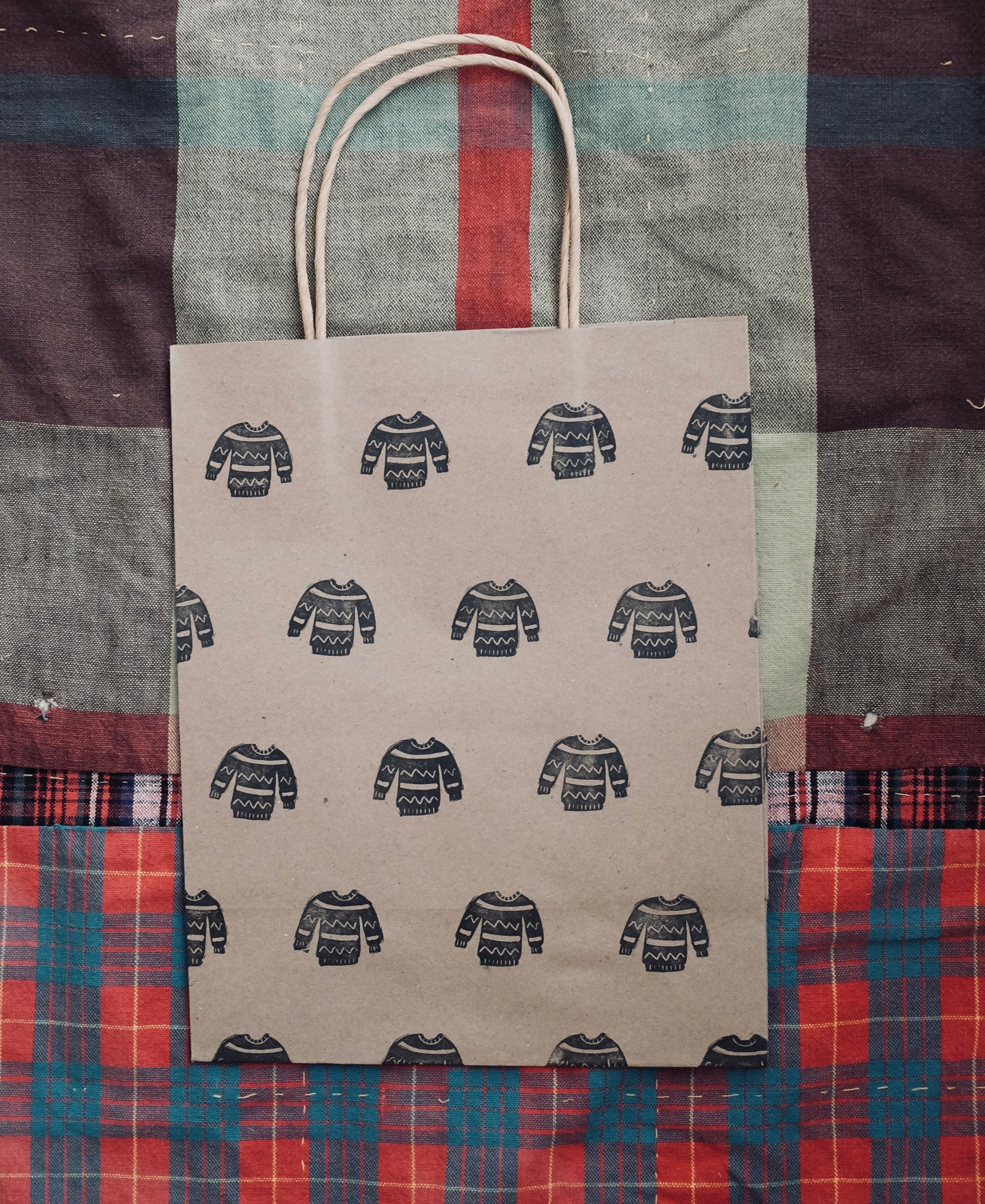 Each stamp design is hand carved and each gift bag is manually stamped using an ancient West Texas technique referred to as “eyeballing it”. As such, each bag will vary ever so slightly in terms of alignment and inking. That's the fun part!